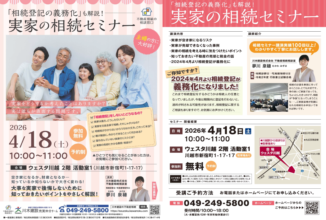 川木建設「不動産相続相談室」では、4月18日(土)に不動産相続相談室の夢川による『実家の相続セミナー』を開催いたします。
